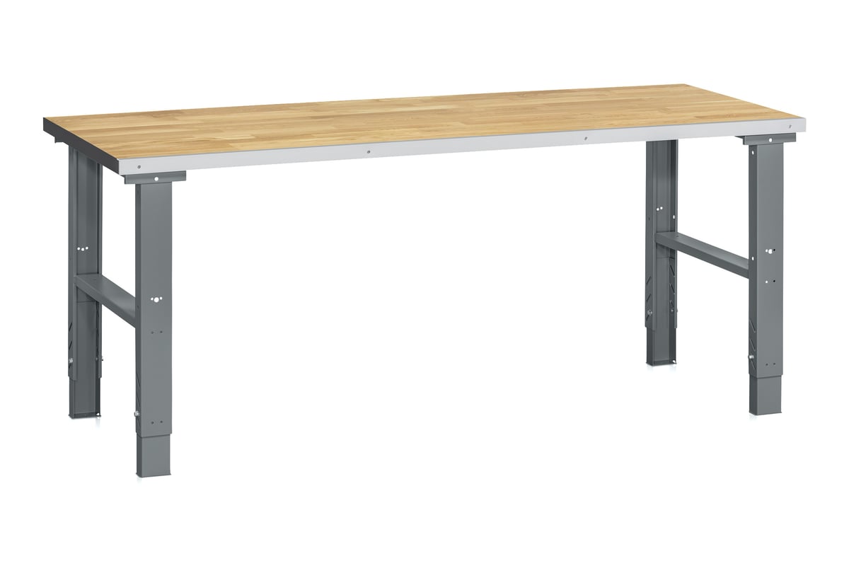 Komplet filebænk med justerbare stålbukke og en slidstærk egeparketbordplade (2000x800x40 mm). Maksimal belastning: 500 kg.