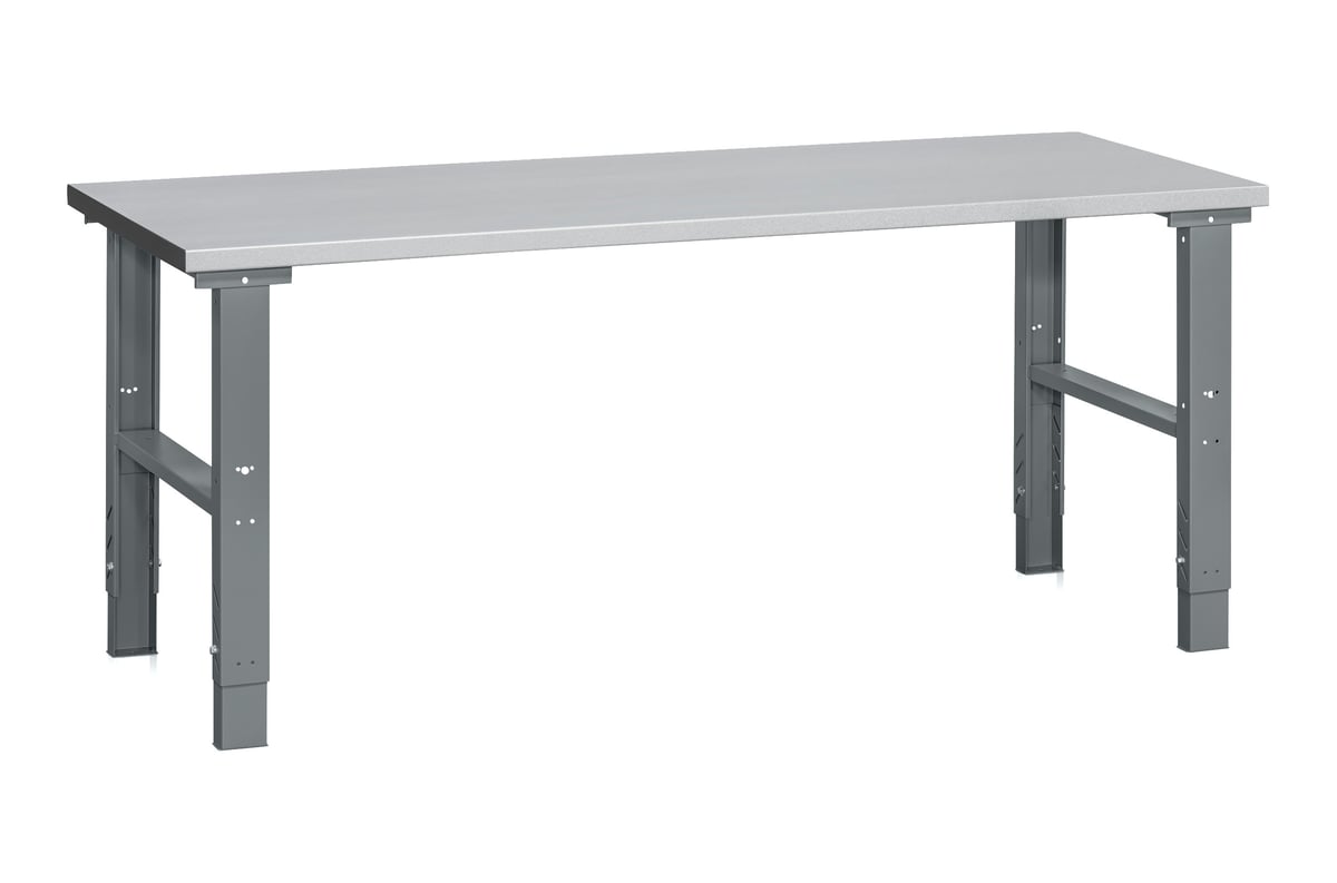 Komplet filebænk med justerbare stålbukke og en slidstærk stålbordplade (2000x800x40 mm). Maksimal belastning: 500 kg.