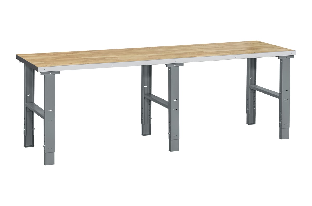 Komplet filebænk med justerbare stålbukke og en slidstærk egeparketbordplade (2500x800x40 mm). Maksimal belastning: 500 kg.