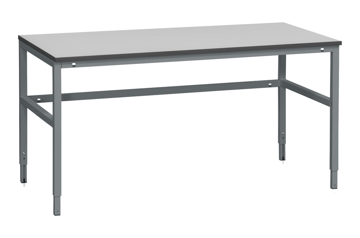 Komplet filebænk med manuelt justerbare ben i stål og en slidstærk laminatbordplade. Ideel til montagearbejde med god modstandsdygtighed over for væsker og kemikalier. Max belastning: 300 kg.