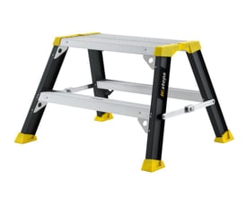 Stabil og sikker arbejdsbuk med dybe trin og praktisk platform. Ideel til pladsbesparende brug. Kraftig aluminiumsprofil for stabilitet.