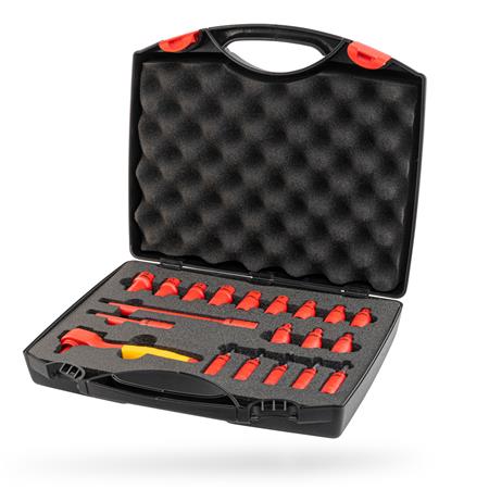 Sættet indeholder forlængere, der giver mulighed for at nå dybtliggende skruer, og et bredt udvalg af toppe med indvendig og udvendig sekskant sikrer alsidighed. Værktøjet er organiseret i en holdbar kuffert for nem transport og opbevaring. Hvert værktøj er separat testet ved 10.000 V AC og godkendt til 1.000 V AC i henhold til IEC 60900.