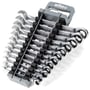 Ringskralde-/gaffelnøglerne er fremstillet af krom-vanadium-stål af høj kvalitet, hvilket giver dem en lang levetid og robusthed, ikke mindst på grund af deres korrosionsbestandige og rengøringsvenlige overflade. Sættet består af de 12 mest almindelige størrelser fra 8 til 19 mm, der opbevares ordentligt i en praktisk holder. Holderen kan åbnes med én hånd, så man nemt kan tage den passende størrelse ud.