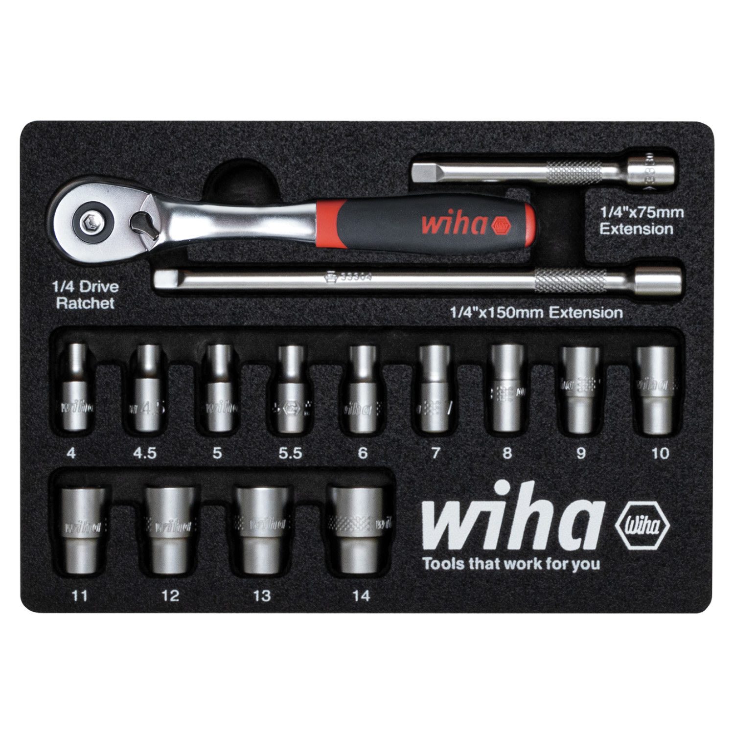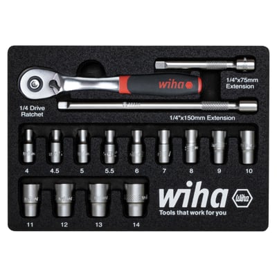 Dette sæt indeholder de 13 mest almindelige 1/4" toppe i størrelserne fra 4 til 14 mm, en skraldenøgle og to forlængere. Den medfølgende skraldenøgle giver brugeren den nødvendige arbejdsfleksibilitet.