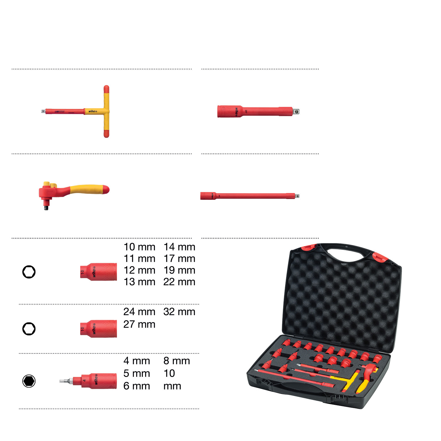 Wiha VDE 1000V 3/8” topnøglesæt med 20 dele. Isolerede toppe med tynd isolering for bedre tilgang. Inkl. skraldenøgle, T-greb og forlængere. Godkendt til 1.000 V AC.
