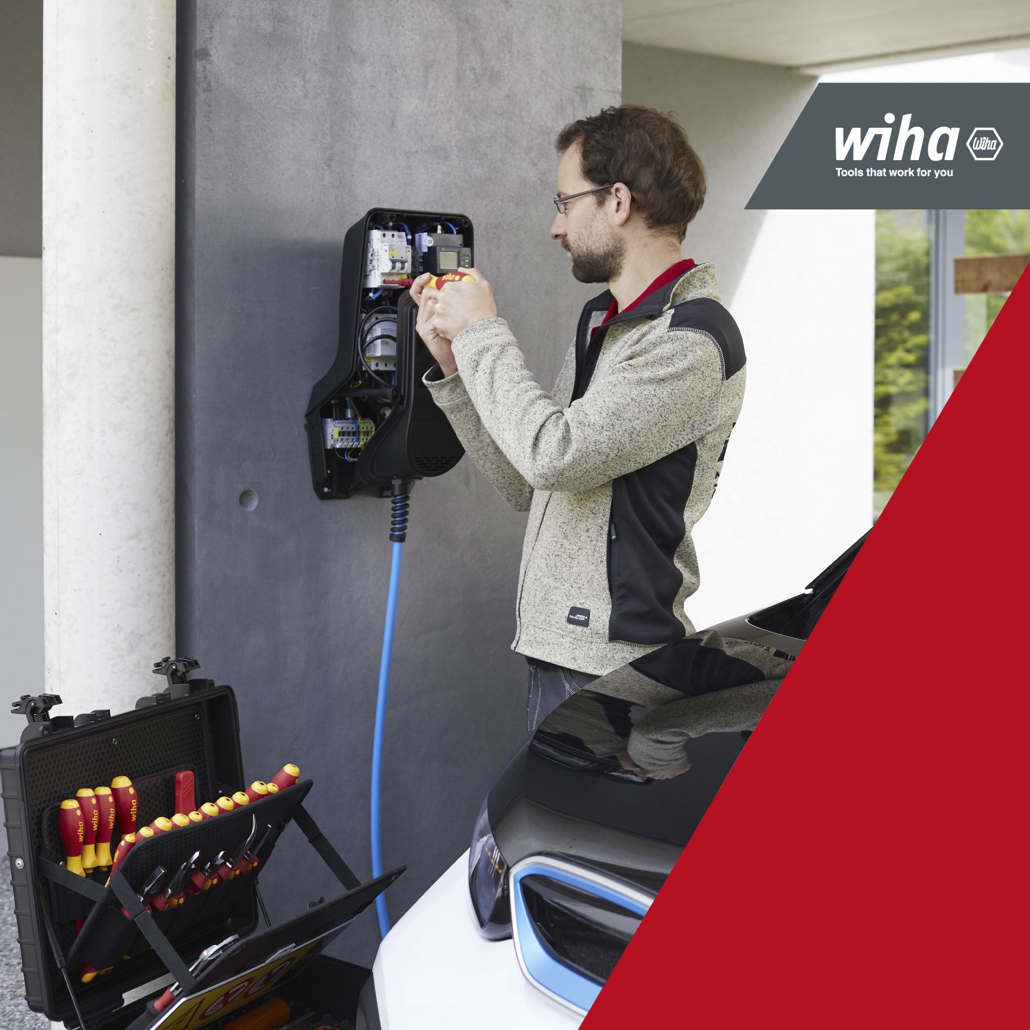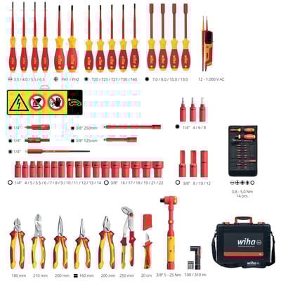 Komplet Wiha eMobility værktøjssæt med 70 dele, designet til professionelle inden for elbilindustrien. Indeholder et bredt udvalg af isolerede værktøjer.