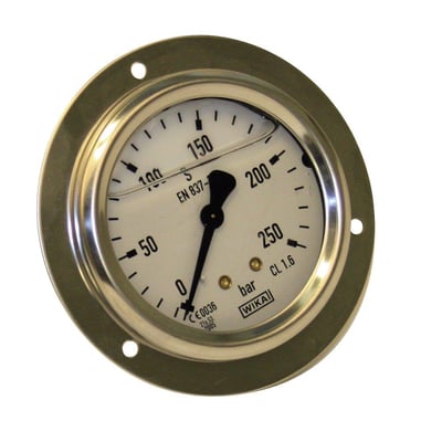 Højkvalitets manometer med frontflange til indbygning i industri applikationer. Velegnet til vand, luft, olier samt ikke-aggressive væsker. Klasse 1,6 tolerance.