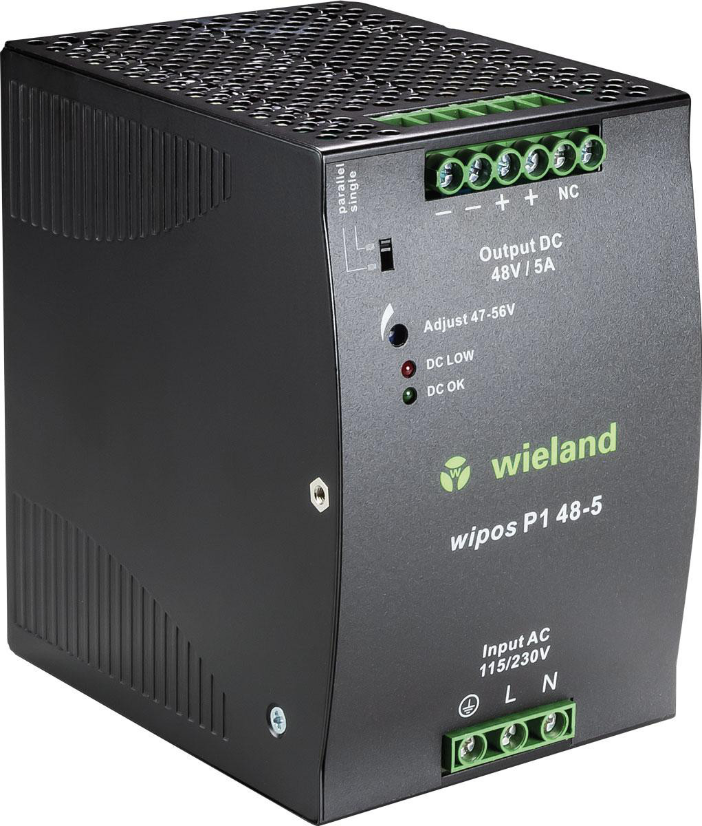 Denne Wipos strømforsyning er en 1-faset model, der leverer 18V ved 5A. Den er designet i overensstemmelse med EN61558-2-16 standarden og har skruetilslutning.
