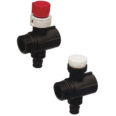 Uponor Vario PLUS fordelerrørssæt med én kreds til gulvvarme, et med rød justeringsknap og et med hvid prop.