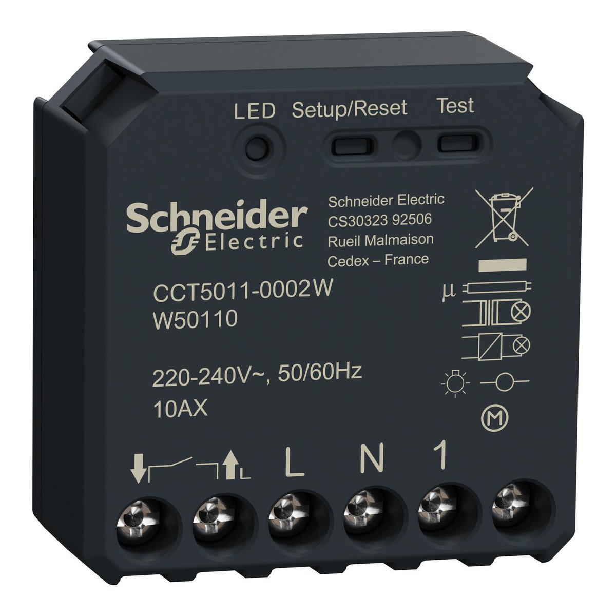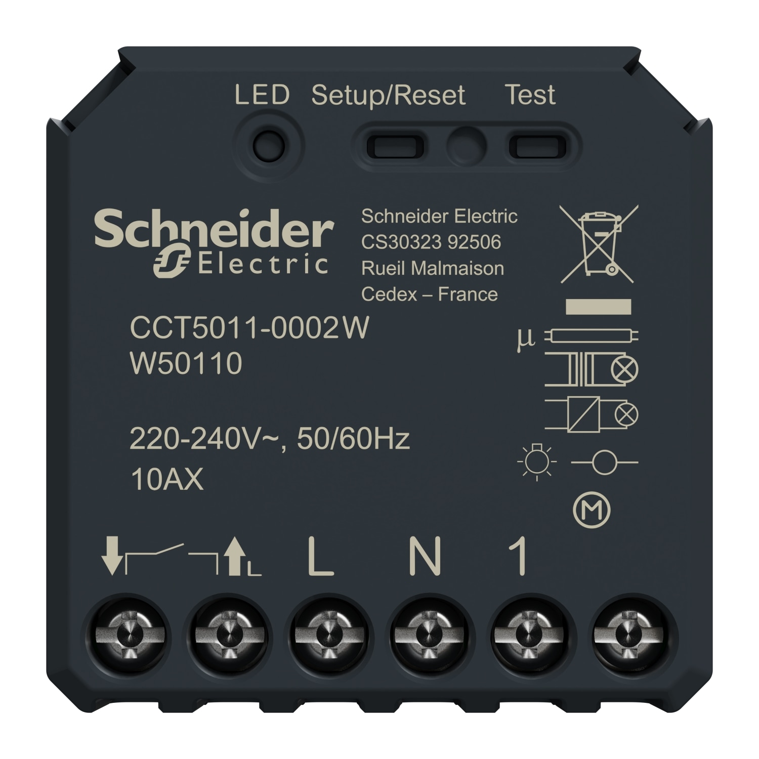 Wiser Home lysstyringsrelæ fra Schneider Electric muliggør fjern- eller lokalstyring samt programmering og integration i smarthus-scenarier via Wiser Home appen. Installationen foregår indvendigt i en væg- eller installationsboks tæt på armaturet.