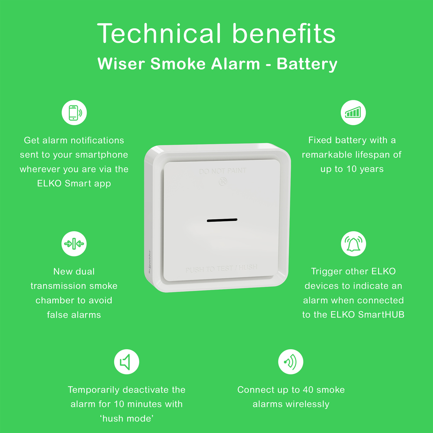 Røgalarmen integreres problemfrit med Wiser systemet via Wiser Gateway, hvilket giver dig mulighed for at modtage notifikationer direkte på din telefon via Wiser appen. Du kan også programmere systemet til at tænde lyset, når alarmen aktiveres, hvilket kan hjælpe med at skabe opmærksomhed og guide dig sikkert ud.