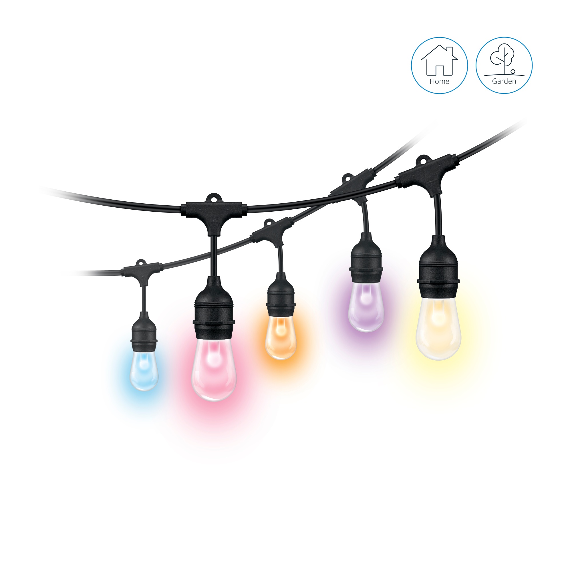 WiZ Imageo lyskæde er den ideelle løsning til at skabe en hyggelig og stemningsfuld atmosfære i dine udendørsarealer, hvad enten det er i haven, på terrassen eller altanen. Med en længde på 14,6 meter og 12 smarte pærer kan du nemt tilpasse lyset til enhver lejlighed.