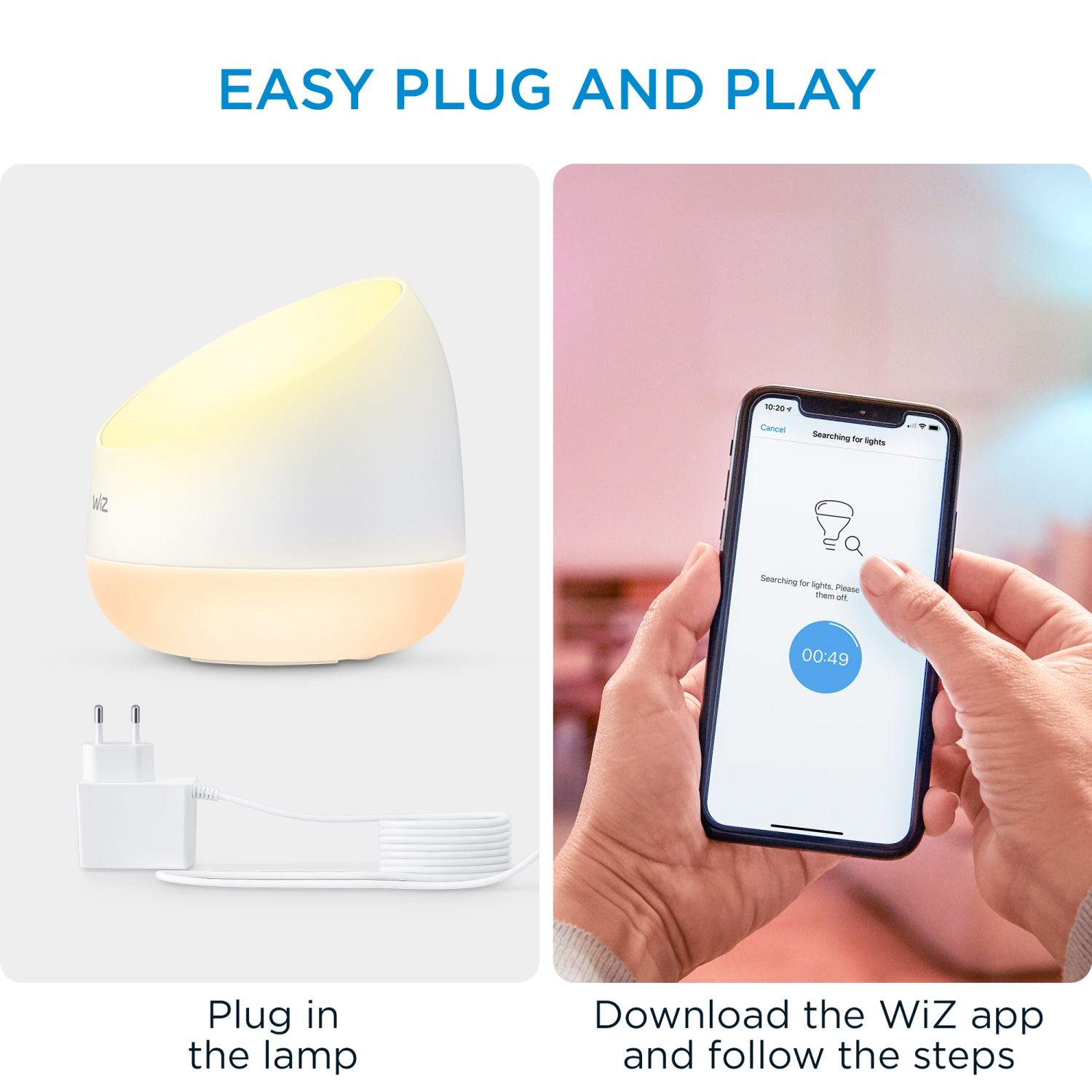 Squire er perfekt både til at sørge for den helt rette tone af hvidt lys til at øge koncentrationen, gøre læsningen lettere eller til at slappe af, samt til at skabe en festlig atmosfære med unikke dynamiske lyseffekter og 16 millioner farver at vælge mellem. Lampen er plug and play, så du kan let komme i gang med det samme og styre lyset direkte. Du kan også nemt kontrollere og justere lyset med den gratis, brugervenlige WiZ app eller stemmekontrol via en stemmeassistent.