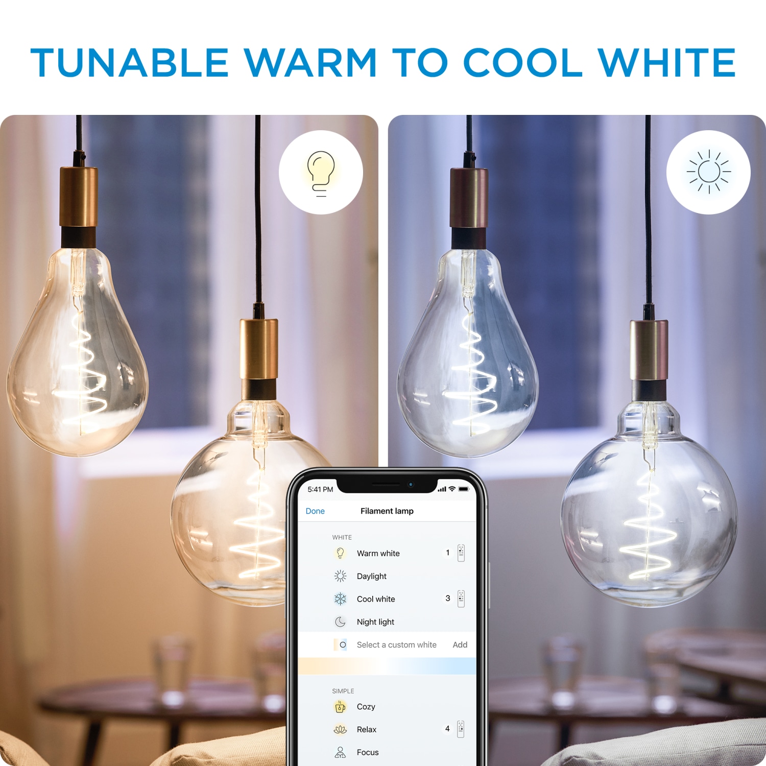 Den stilfulde Filament Amber Tunable White-serie kan beskrives som moderne, klassiske pærer, der ligner de gamle glødetrådspærer i både design og lysegenskaber. Filament Amber Tunable White ligner en glødetrådspære med de synlige LED-tråde og tonet ravgult glas. Lyset kan indstilles fra et ravgult skær på 2000 kelvin til dagslyshvid på 5000 kelvin. Med Filament Amber Tunable White-serien får du pærer i mange designs med et smukt, gammeldags udtryk, fyldt med det nyeste indenfor belysnings- og tilslutningsteknologi.