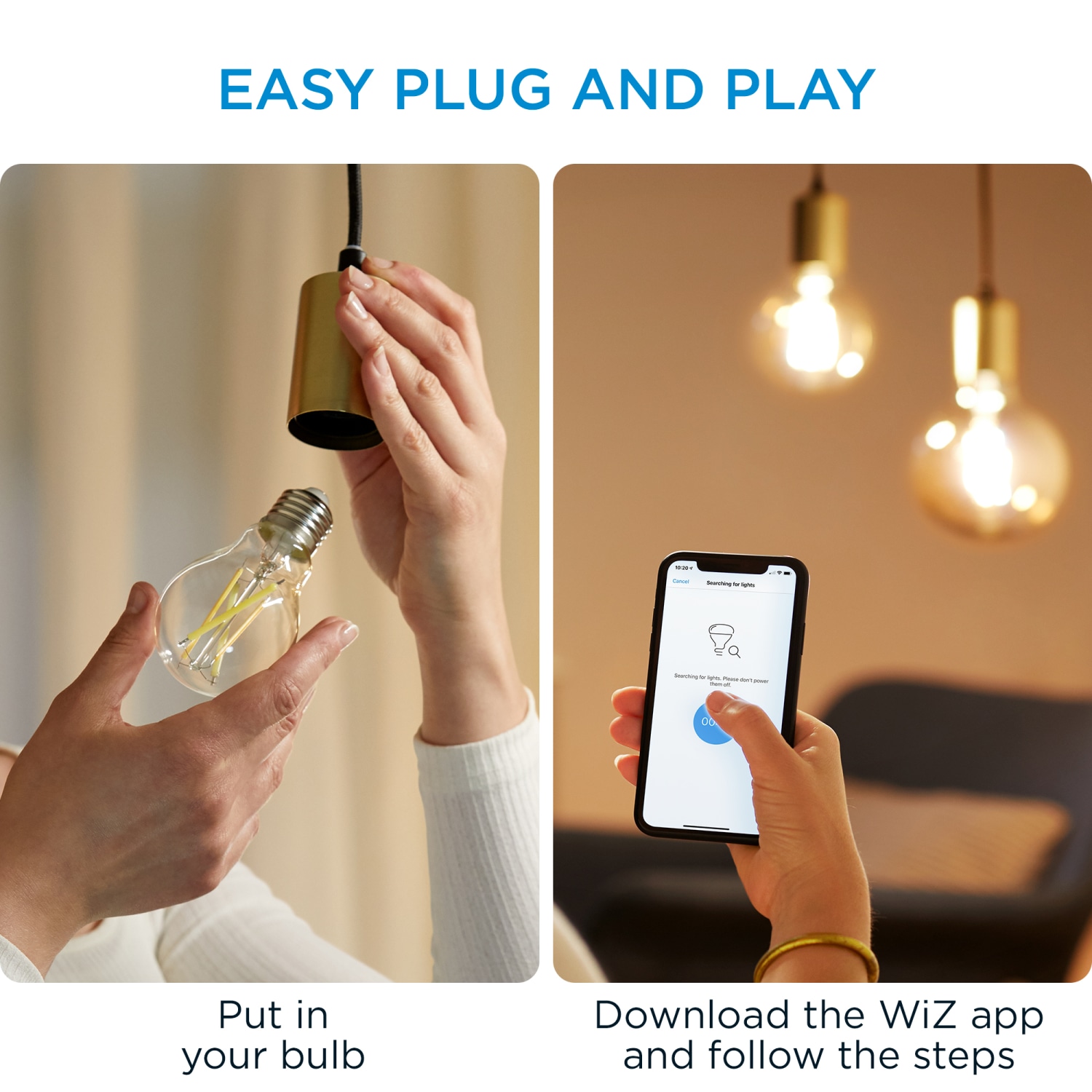 WiZ pæren er nem at installere og parre med WiZ appen. Du kan styre lyset fra hvor som helst og tilpasse det til forskellige situationer med forudindstillede lysindstillinger og scener. Skab den perfekte stemning i dit hjem med WiZ.