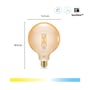 Filament Amber G125-pæren er en stor globusformet pære med en diameter på 125 mm og i dette tilfælde med den klassiske E27-fatning. Den kan med sine synlige LED-tråde og tonet ravgult glas betegnes som den moderne, klassiske pære, da den ligner de gammeldags glødepærer i både design og lysegenskaber. Filament Amber G125-pærens temperatur kan via den trådløst forbundne app indstilles fra kold til varm hvid mellem 2200 og 5500 kelvin og lyse op til 650 lumen. Via den trådløst forbundne app kan du øge eller dæmpe lysstyrken med din smartphone. Selvom det er en stor pære, gør LED-trådene den til en naturlig energisparepære med lang holdbarhed og levetid samt energimærke "A". Det betyder, at den kun bruger 7,5 watt, hvilket svarer til en gammeldags 50-watts pære i lysstyrke, og den har en levetid på 15.000 timer.