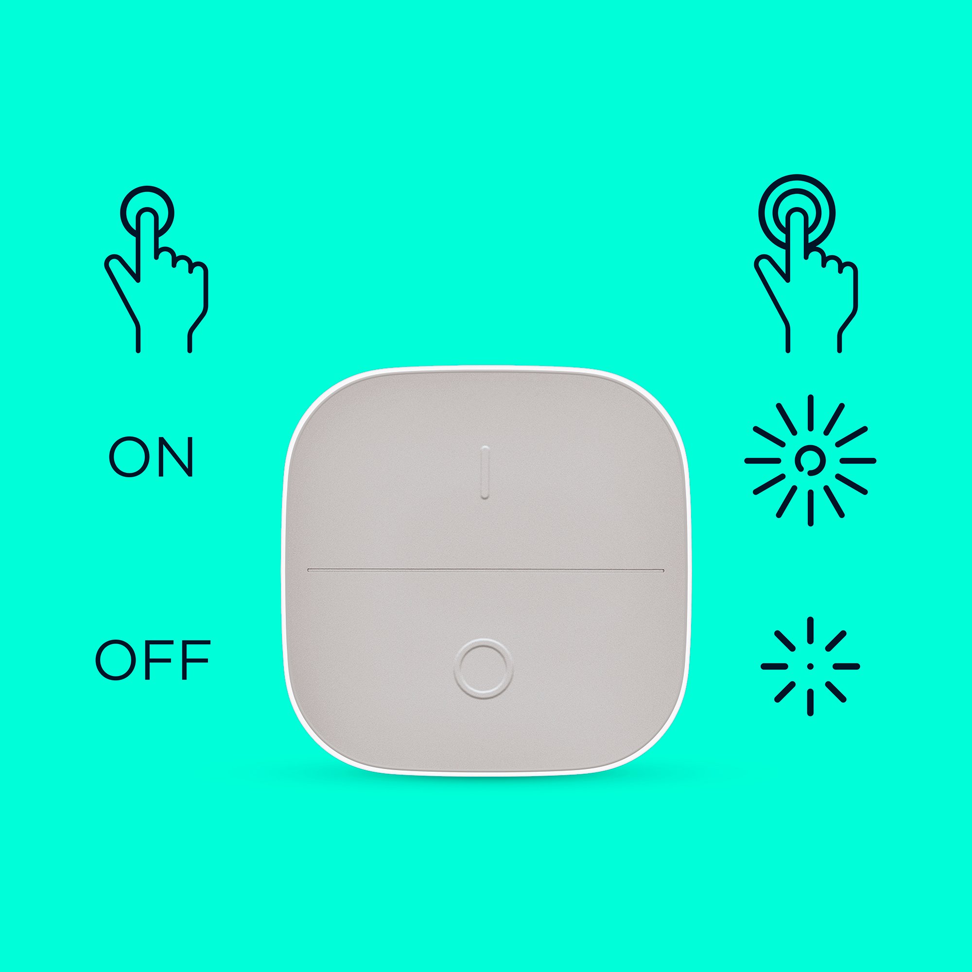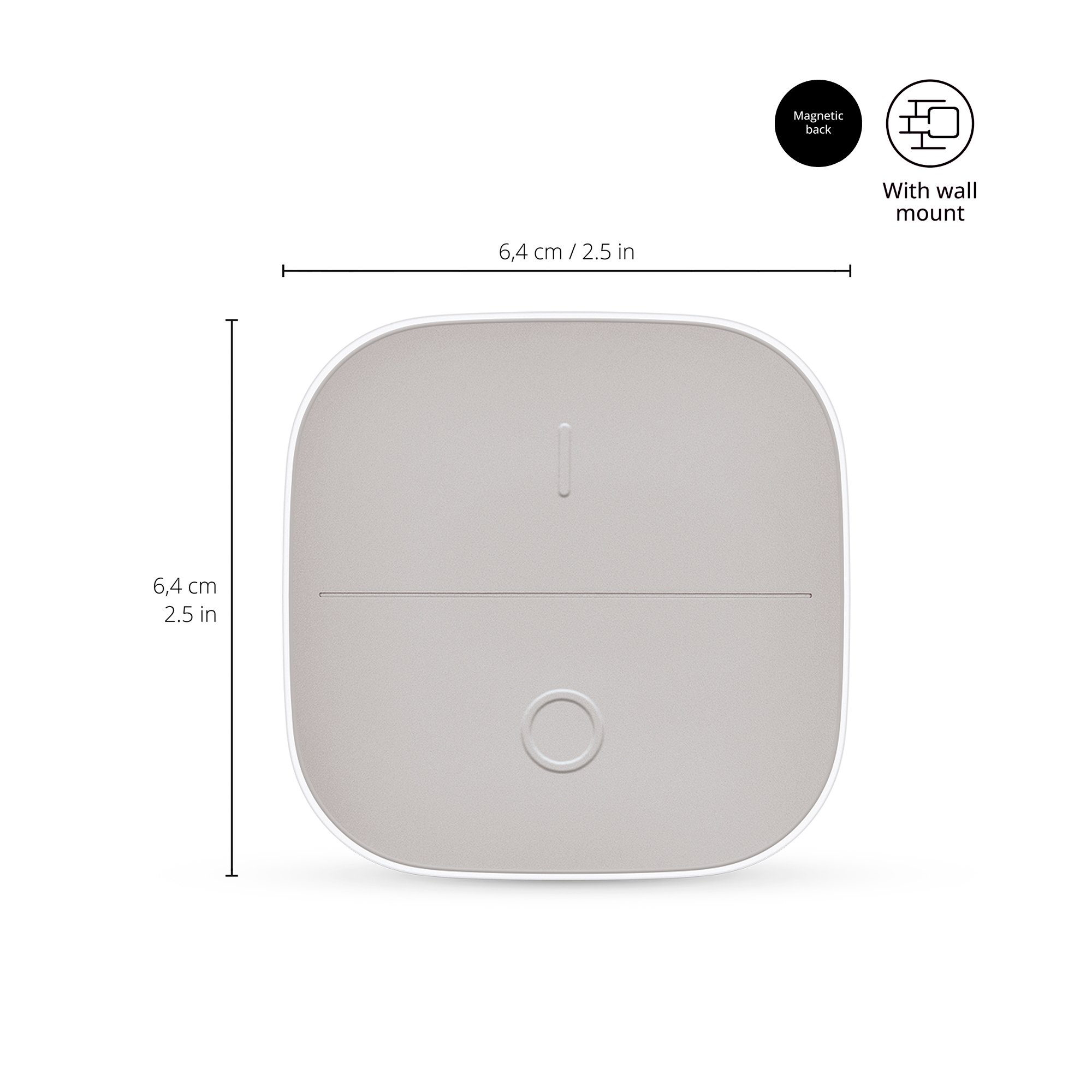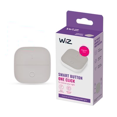 WiZ Portable button gør det nemmere end nogensinde før at justere din intelligente belysning fra WiZ. Denne trådløse, batteridrevne fjernbetjening giver hurtig adgang til at kontrollere alt dit WiZ lys i et helt rum. Med to knapper er det blot et spørgsmål om at trykke på en af dem i kortere eller længere tid for at tænde eller slukke dit lys eller for at lysne eller dæmpe belysningen. Sæt den fast på væggen for at bruge den som en almindelig kontakt, og nyd muligheden for blot at kunne tage kontakten med dig som en fjernbetjening. Den er endda magnetisk, så du kan også hænge den på dit køleskab eller på en hvilken som helst metaloverflade. Med en rækkevidde på op til 15 meter og fuld funktionalitet selv når din Wi-Fi er nede, gør Portable kontakten det endnu nemmere at nyde WiZ oplevelsen fuldt ud.