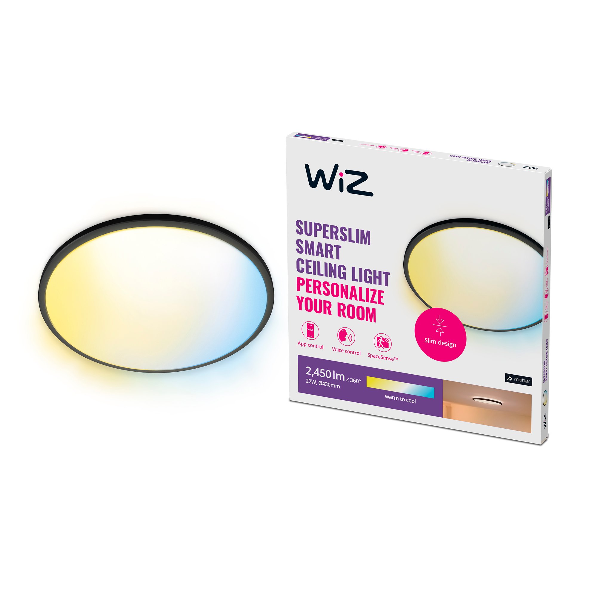 Med WiZ Superslim LED plafond er det nemt at tilpasse lyset til din hverdag. Den store, runde lysflade kan lyse med både køligt blåt lys og dæmpes til blødt hvidt lys, perfekt til afslapning. Du kan indstille lyset fra 2700K til 6500K (varmt hvidt lys til koldt hvidt lys) og skabe den rette stemning.