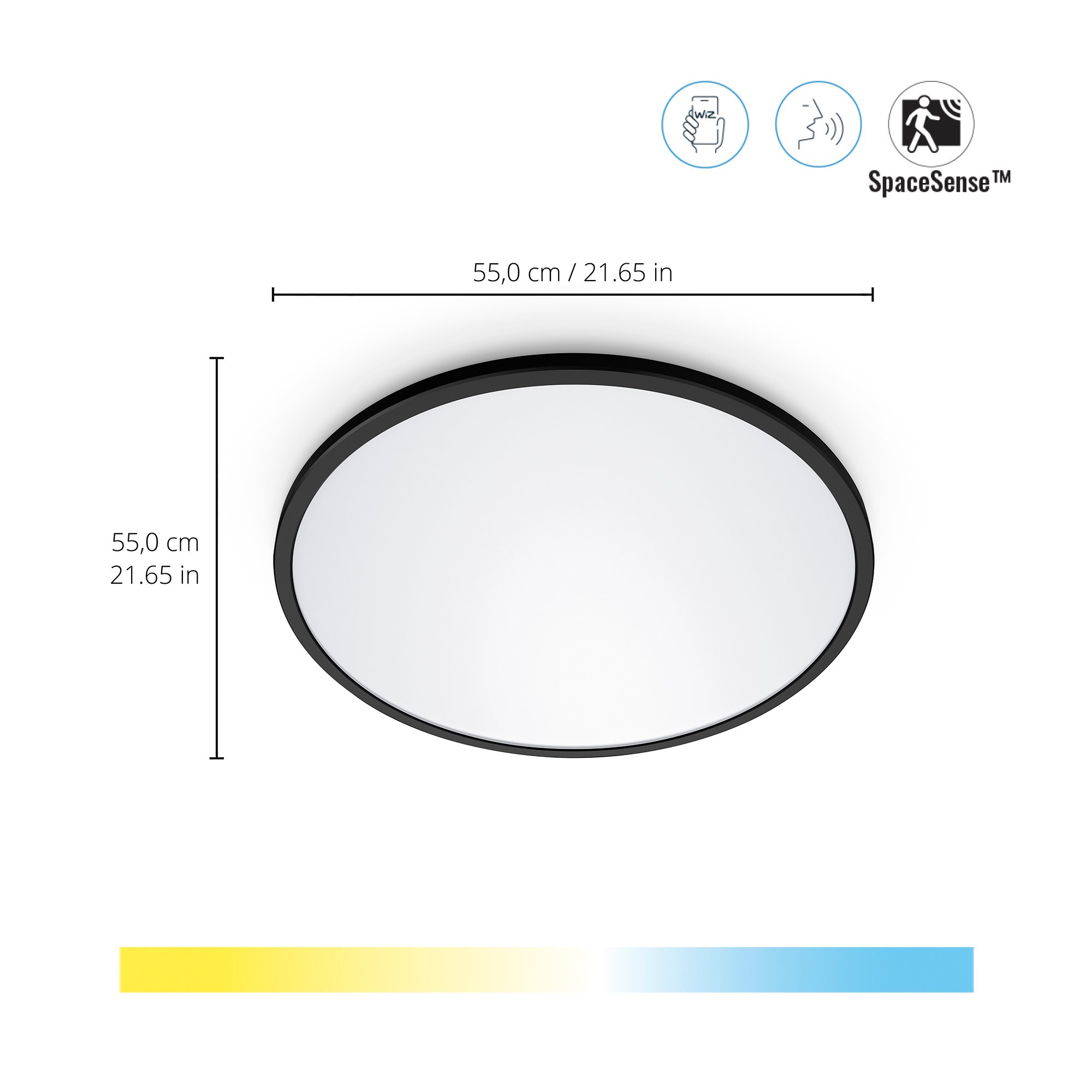 Med Superslim LED plafond er det legende let at tilpasse lyset til din hverdag. Den kommer med en stor rund lysflade, som enten kan fylde rummet med køligt lys, eller dæmpes til blødt hvidt lys, hvis du bare gerne vil slappe af. Den store runde belysningsflade kan indstilles til at lyse fra 2700K-6500K (varmt hvidt lys til neutralt hvidt lys), alt efter hvilken stemning, der skal sættes.