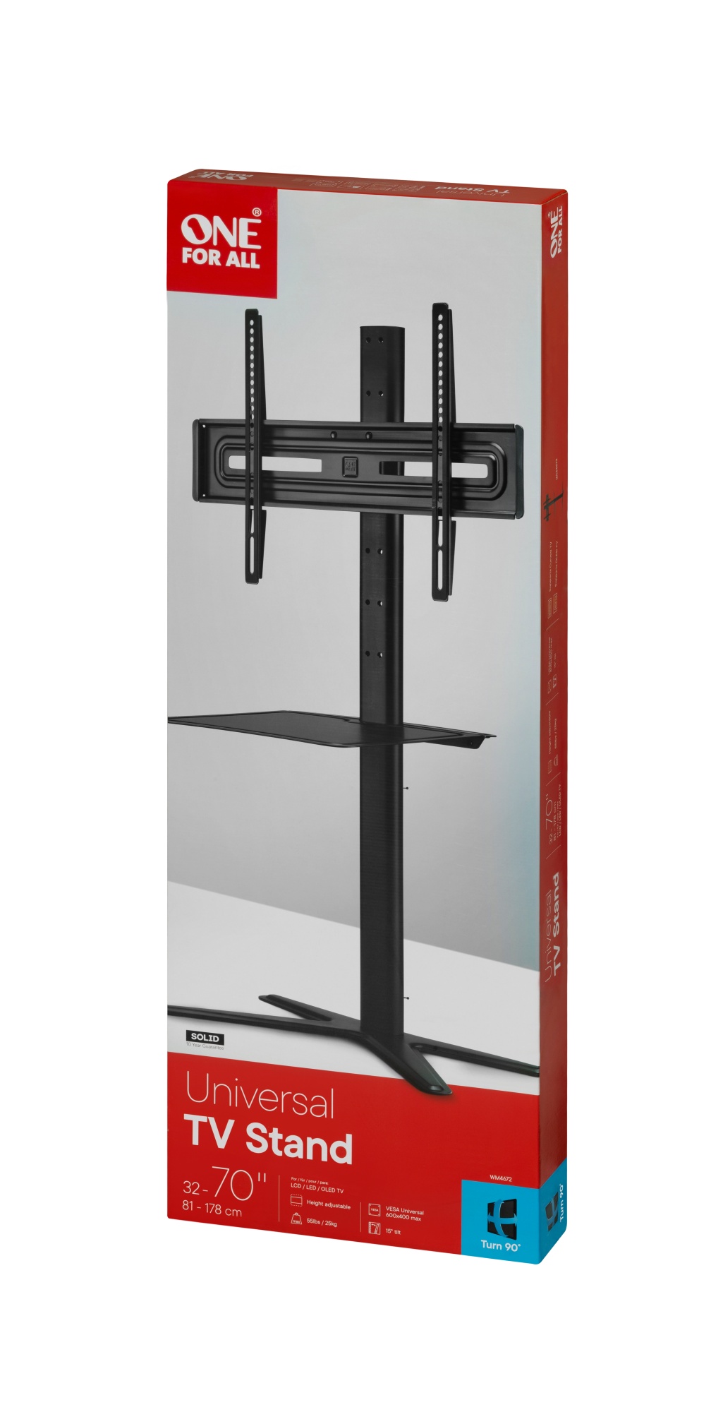 Gulvstanderen kommer i en stilren sort farve, der passer ind i de fleste indretninger. Den integrerede hylde giver praktisk opbevaring til medieafspillere, soundbars eller andre TV-tilbehør, hvilket skaber en organiseret og minimalistisk opsætning. Den justerbare funktion med dreje- og vippemuligheder sikrer, at du altid kan finde den perfekte position, uanset hvor i rummet du befinder dig.