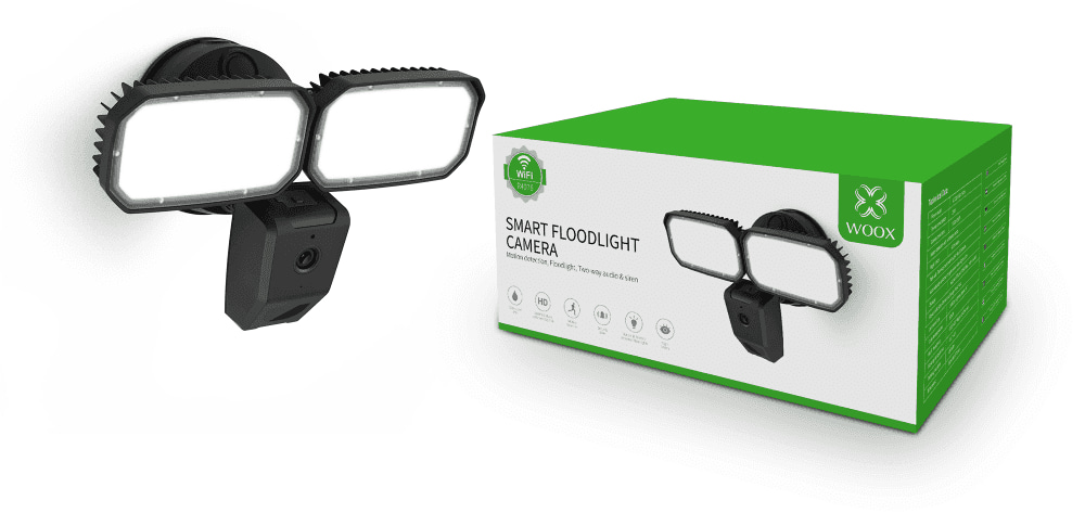 Beskyt dit hjem med Woox projektørkameraet. Dette WiFi-kamera har en indbygget sirene på 110 decibel og 2 skarpe lys på 3000 lumen, så intet i mørke kroge undslipper din opmærksomhed.