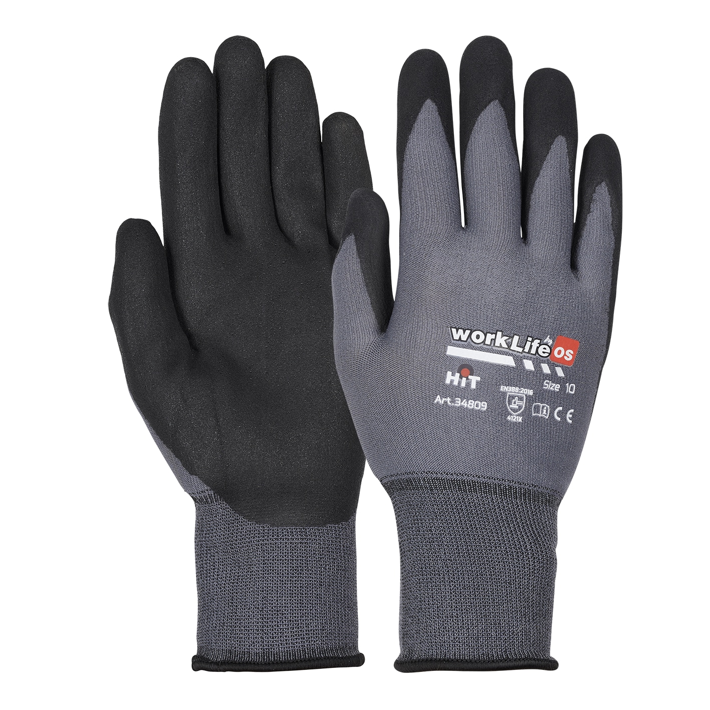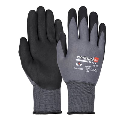 Sømløs handske med ribkrave. Belægning af ru nitril-foam. Uforet. Kategori II. Halvdyppet grå med sort belægning. Allround monteringshandske.