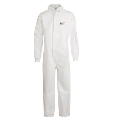 Den hvide heldragt er udstyret med en tredelt hætte, der giver optimal dækning og pasform. En lynlås med selvklæbende flap sikrer en tæt lukning, og ribkanter ved håndled samt elastik ved ankler og hætte bidrager til en sikker og komfortabel pasform, der minimerer risikoen for indtrængning af skadelige stoffer.