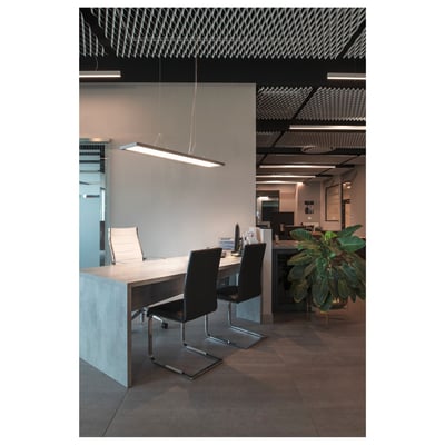 Den sølvfarvede Worklight PD pendellampe er designet til at opfylde alle krav til moderne arbejdspladsbelysning. Med sin indbyggede LED-lyskilde leverer den en lysstrøm på 5000 lumen, en lav blændingsværdi (UGR ≤ 19) og en farvetemperatur på 4000 Kelvin. Dette sikrer et neutralt hvidt lys, der er ideelt til at fremme produktiviteten.