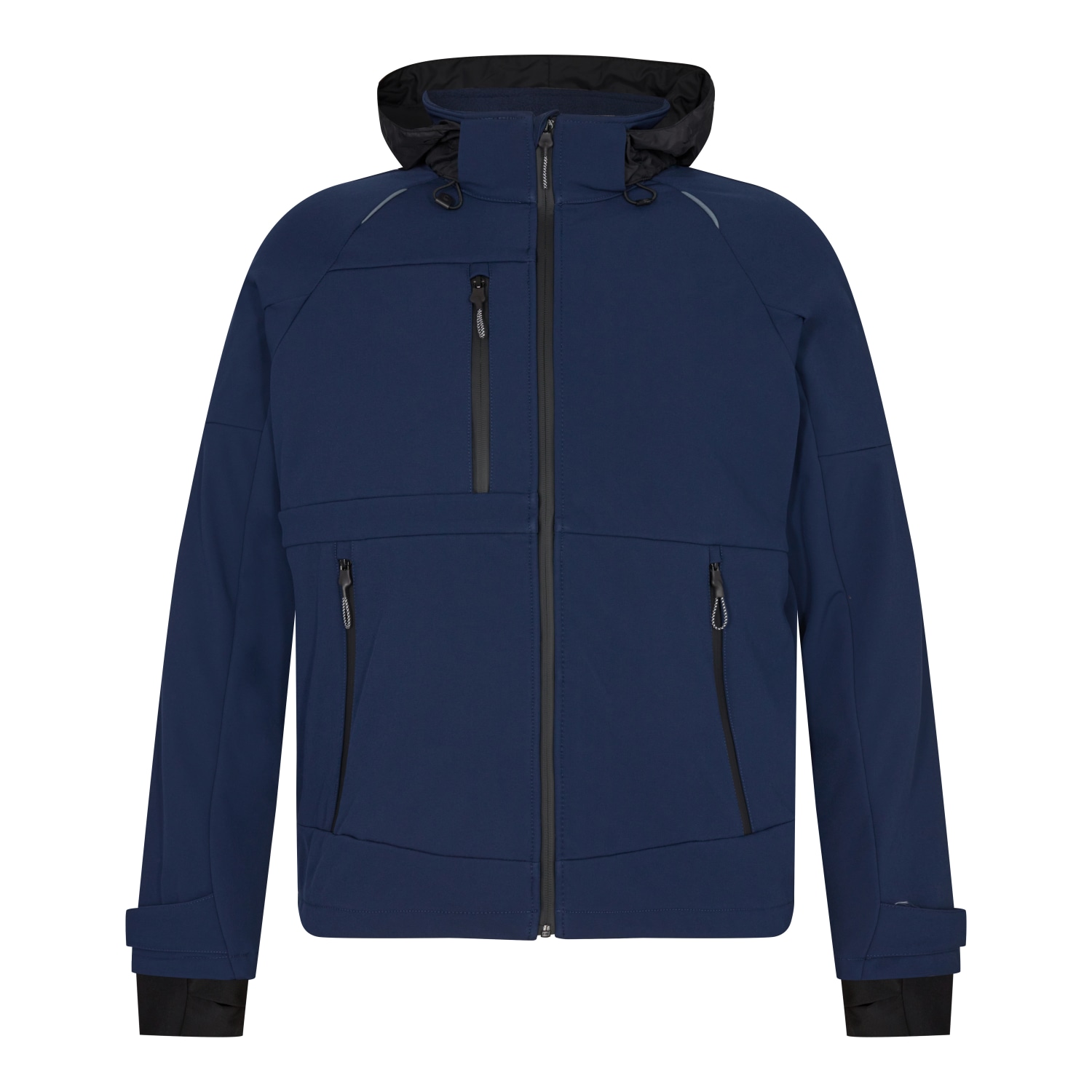 FE Engel X-treme softshelljakke i blå, str. 5XL. En robust jakke designet til komfort og funktionalitet i krævende miljøer.