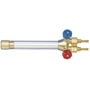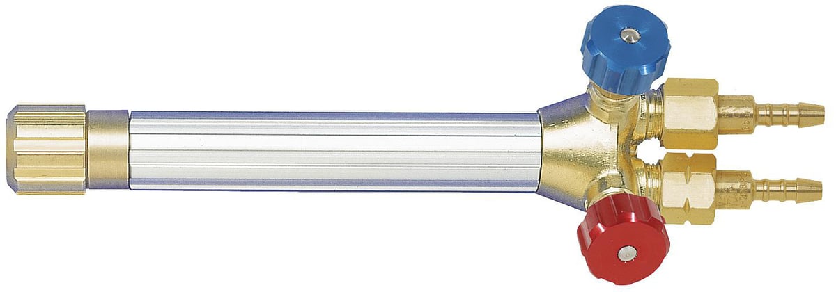 Dette er et rundt svejse-/skærehåndtag af typen X21, der er designet til professionel brug. Håndtaget er udstyret med slangestudse på 6,3 mm, hvilket sikrer en sikker og effektiv forbindelse til dine svejse- og skæreudstyr.