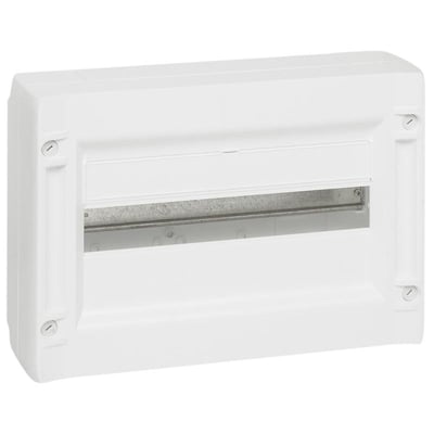 Pålidelig tavle til påbygning med 18 moduler pr. række, hvid RAL 9003, fuldt vendbart kabinet og flytbare DIN-skinner for nem montering.