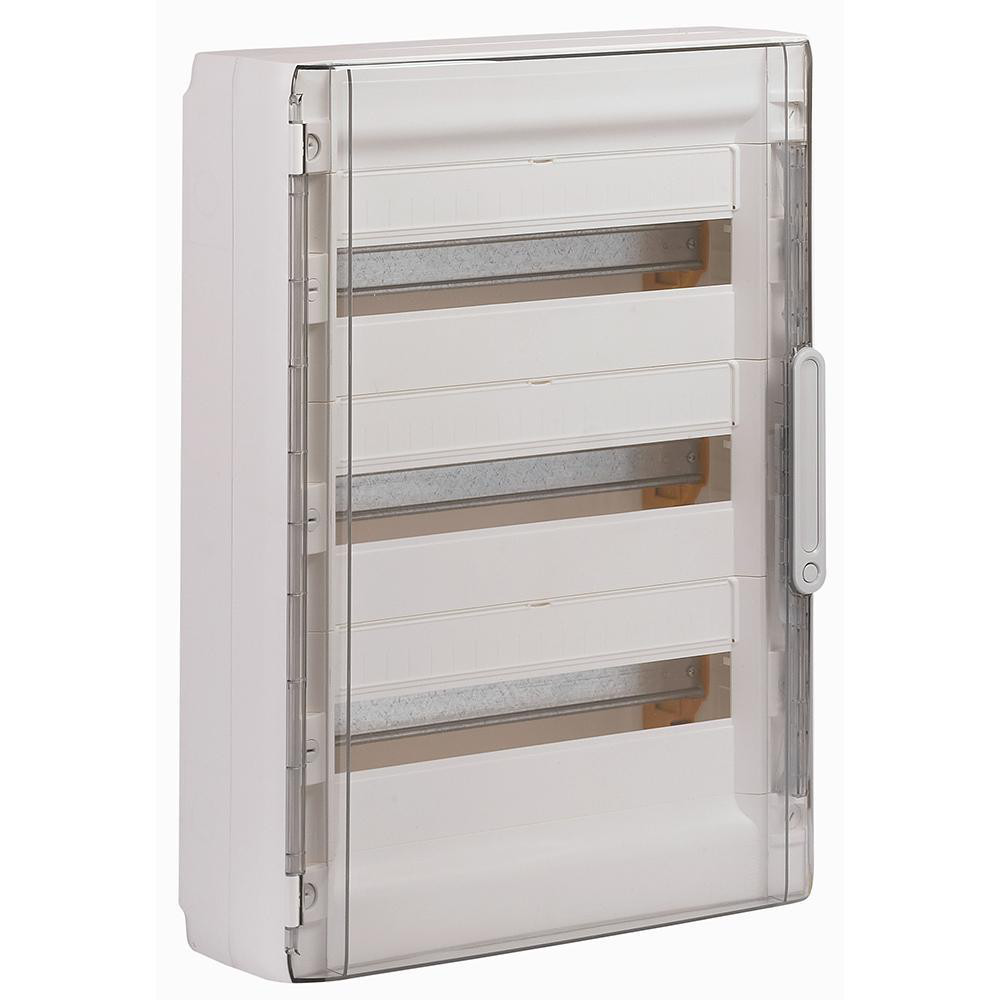 Tavle for påbygning med en kapacitet på 18 moduler pr. række. Hvid RAL 9003. Fuldt vendbart kabinet og leveres med flytbare og drejelige DIN-skinner.