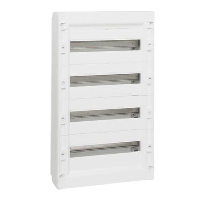 XL3 125 tavle for påbygning med en kapacitet på 18 moduler pr. række. Hvid RAL 9003 og fuldt vendbart kabinet. Leveres med flytbare og drejelige DIN-skinner.