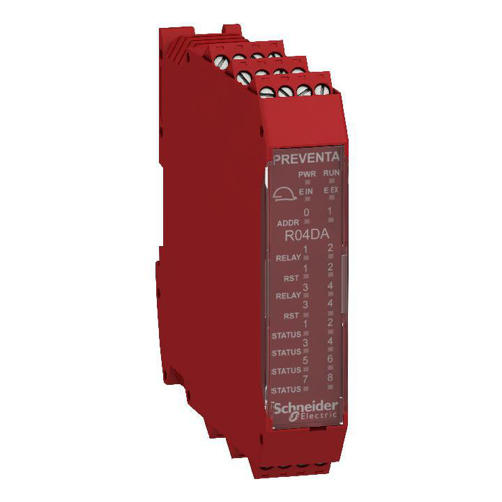 XPSMCM udvidelsesmodulet har 4x2 sikkerhedsudgange (relæ) og 8 standardudgange. Løsningen kan opnå op til Performance e kategori 4 i henhold til 13849-1. Sikkerhedsmodulet kan håndtere op til 4 sikkerhedszoner, hvis løsningen skal være dubleret. Modulet skal altid være forbundet med en Preventa sikkerhedscontroller XPSMCMCP0802.