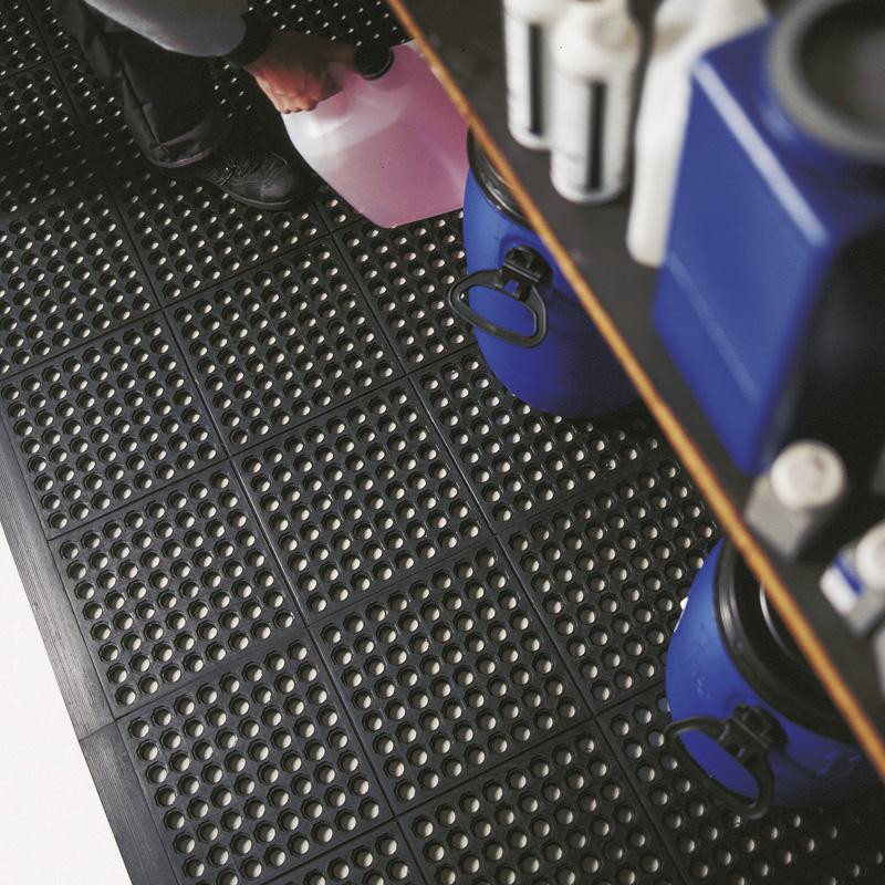 Små dupper på undersiden løfter måtten op fra gulvet, hvilket forbedrer luftcirkulationen og forhindrer fugtophobning. Hulmønstret giver en skridsikker overflade, der effektivt slipper væde igennem og opsamler snavs som f.eks. spåner.