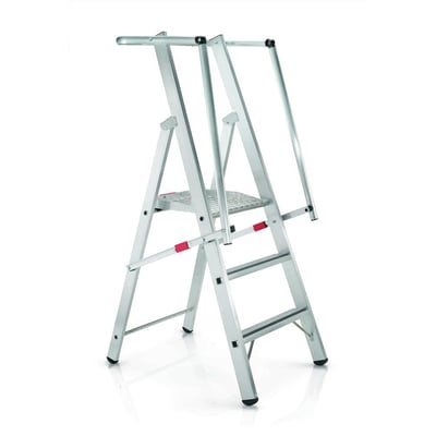 Zarges ZAP Neo S platformstige med sammenklappelige håndlister og stor platform (400 x 400mm). 3-sidet gelænder og 80mm dybe trin med sikkerhedsrifling. Overholder EN 131.