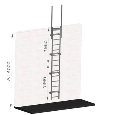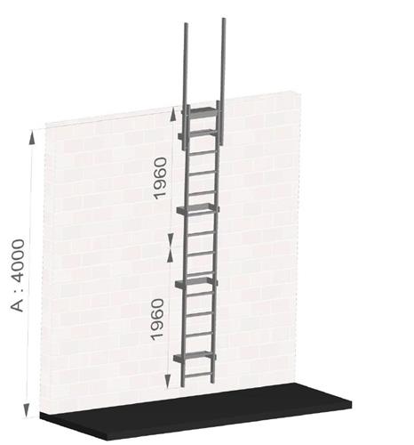 Stationær stige til montering på bygninger for vedligeholdelse, som nødstige eller maskinadgang. Afstand mellem vægholdere: maks. 2,00 m.