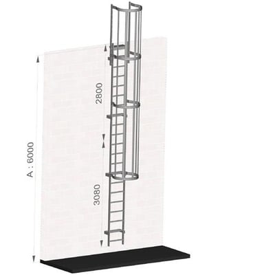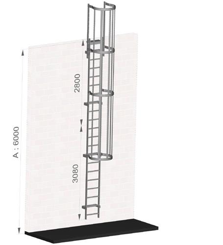 Stationær stige til montering på bygninger til vedligeholdelse, som nødstigeanlæg eller maskinadgang. Afstand mellem vægholdere: maks. 2,00 m.